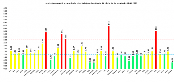 Potrivitcelor mai recente date furnizate de către Grupul de Comunicare Strategică, 4.403 de cazuri noi de persoane infectate cu SARS – CoV – 2 au fost raportate sâmbătă, 9 ianuarie, ceea ce duce la un total de 668.202 de persoane infectate cu noul coronavirus pe teritoriul României, de la debutul pandemiei deCOVID-19.
