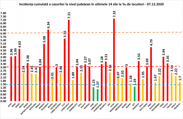 Rată mare de incidență se înregiatrează și în județele Cluj (5,55), Brașov (5,08), sau Sibiu (4,79), în vreme ce valori mici are incidenței înregistrate la 14 zile cu noul coronavirus sunt înregistrate în județele Buzău (5,01), Călărași (3.00), Botoșani (2,41) sau Harghita (1,07).
