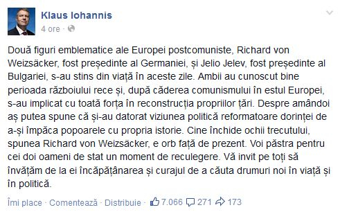 „Două figuri emblematice ale Europei postcomuniste, Richard von Weizsäcker, fost președinte al Germaniei, și Jelio Jelev, fost președinte al Bulgariei, s-au stins din viață în aceste zile. Ambii au cunoscut bine perioada războiului rece și, după căderea comunismului în estul Europei, s-au implicat cu toată forța în reconstrucția propriilor țări. Despre amândoi aș putea spune că și-au datorat viziunea politică reformatoare dorinței de a-și împăca popoarele cu propria istorie. Cine închide ochii trecutului, spunea Richard von Weizsäcker, e orb față de prezent. Voi păstra pentru cei doi oameni de stat un moment de reculegere. Vă invit pe toți să învățăm de la ei încăpățânarea și curajul de a căuta drumuri noi în viață și în politică”, este mesajul președintelui Iohannis.