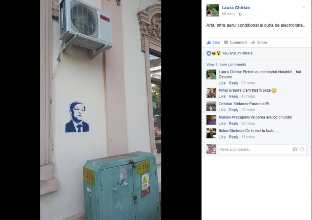 Laura Chiriac a postat o fotografie pe contul personal de Facebook în care apare portretul premierului Dacian Cioloș, pictat pe un zid, „intre aerul conditionat si cutia de electricitate”, așa este cum este precizat și în descriere.