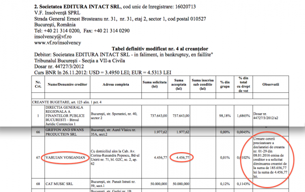 Aceasta datorie vine după ce editura Intact SRL, deținută de Voiculescu împreună cu familie, a intrat pe rând în insolvență, apoi în faliment. Varujan Vosganian era unul dintre creditorii care s-a înscris pentru recuperarea datoriilor.