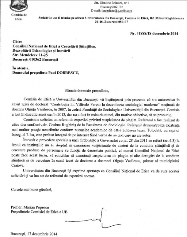„Comisia a solicitat un referat de expertiză privind suspiciunea de plagiat…Referatul demonstrează existența mai multor pasaje neatribuite conform normelor academice de către autoarea tezei. Totodată, un capitol întreg, al 7-lea, este preluat inetgral de pe internet, fiind vorba de un text care nu are autor”, se arată în adresa Universității către Consiliul de Etică, semnată de către președintele Comisiei de Etică a UB, prof. dr. Marian Popescu.