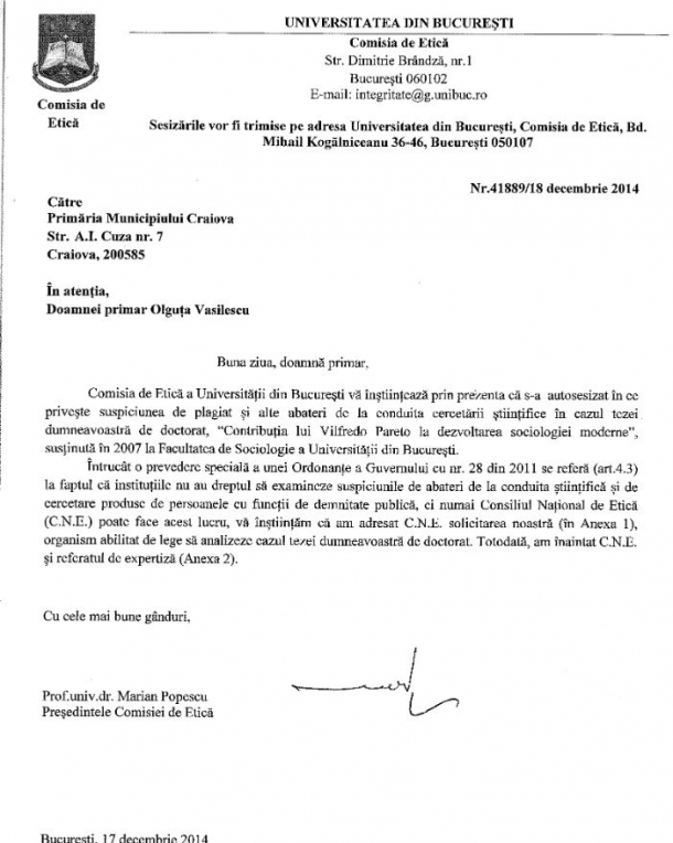 Totodată, Comisia de Etică a trimis o adresă și către Primăria Municipiului Craiova, în care o înștiințează pe Olguța Vasilescu cu privire la suspiciunile de plagiat care planează asupra tezei sale de doctorat.