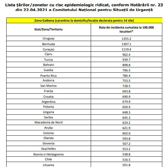 Comitetul Național pentru Situații de Urgență (CNSU) a actualizat lista statelor și zonelor considerate de risc epidemiologic ridicat. Persoanele care ajung în România din aceste teritorii trebuie să stea în carantină 14 zile.