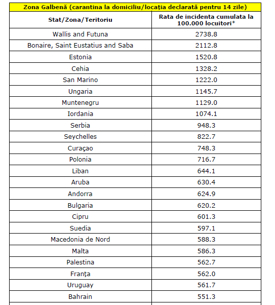 ”A fost aprobată lista țărilor sau zonelor care sunt cu risc epidemiologic ridicat, țările sub incidența codului galben, iar noutatea este că Marea Britanie nu se mai află pe această listă, deci se va putea călători fără intrarea în carantină dinspre Marea Britanie către România”, a precizat șeful Departamentului pentru Situații de Urgență, Raed Arafat, în conferința de presă de la finalul ședinței de Guvern.