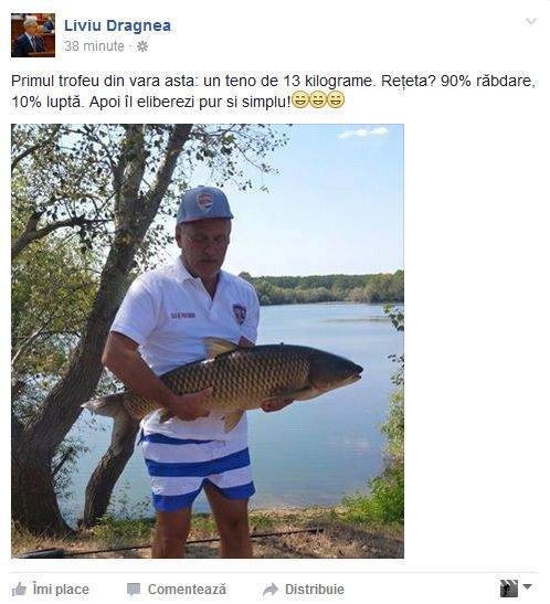 “Primul trofeu din vara asta: un teno de 13 kilograme. Rețeta? 90% răbdare, 10% luptă. Apoi îl eliberezi pur si simplu”, a scris Liviu Dragnea în dreptul fotografiei.