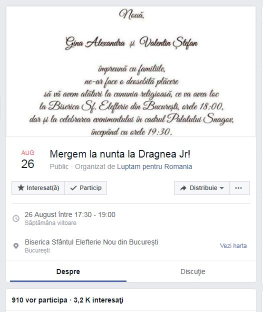 „Mergem la nunta lui Dragnea Jr., sa ii urma „La multi ani!”, cu executare! Atat lui, cat si lui „Daddy” Liviu Dragnea! Ne intalnim cu totii la ora 17:30 la Biserica Sfantul Elefterie. Dupa cununia religioasa, stabilim daca mergem si la Snagov, unde are loc nunta, la care vor participa toti greii din PSD si ALDE!”, scriu organizatorii evenimentului, pe pagina de Facebook.