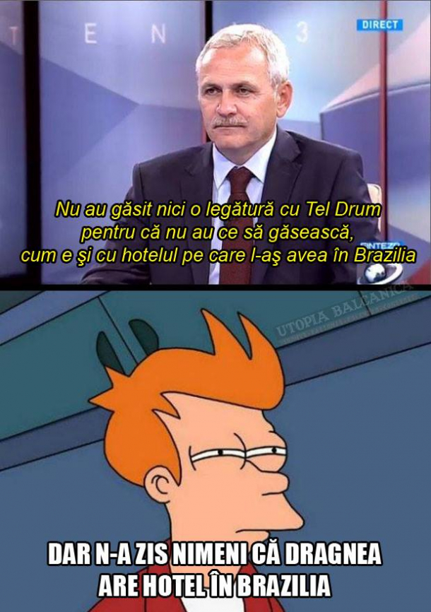 Președintele PSD, Liviu Dragnea, a fost ironizat pe pagina de Facebook "Utopia Balcanică" după ce s-a apărat privind acuzațiile că el este cel care deține de fapt compania TelDrum afirmând că este o informație similară celei privind un hotel din Brazilia.