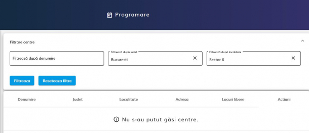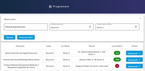 Vineri seară, în jurul orei 19.00, în București nu mai erau locuri libere pentru programare în centrele de vaccinare din sectoarele 1, 2 și 3. În sectorul 4 erau disponibile cele mai multe locuri, aproape 2.050, însă într-un interval de câteva minute, acestea au scăzut la 1.998, ceea ce înseamnă că în decursul serii de vineri, cel mai probabil, se vor epuiza. Aceeași situație este valabilă și în sectorul 5. Iar pentru programarea la vaccinare în sectorul 6 al Capitalei, pe platforma online apare mesajul „nu s-au putut găsi centre”.