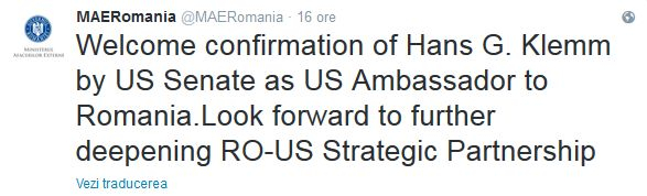 „Salutăm confirmarea lui Hans G. Klemm de către Senatul american ca ambasador SUA în România. Așteptăm cu nerăbdare pe mai departe consolidarea Parteneriatului strategic dintre România și Statele Unite”, se arată pe contul de Twitter al MAE.