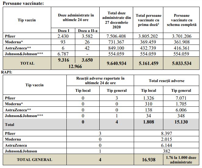 În total, până acum au fost vaccinate în România 5.161.459 de persoane, din care 5.033.534 au schema completă.