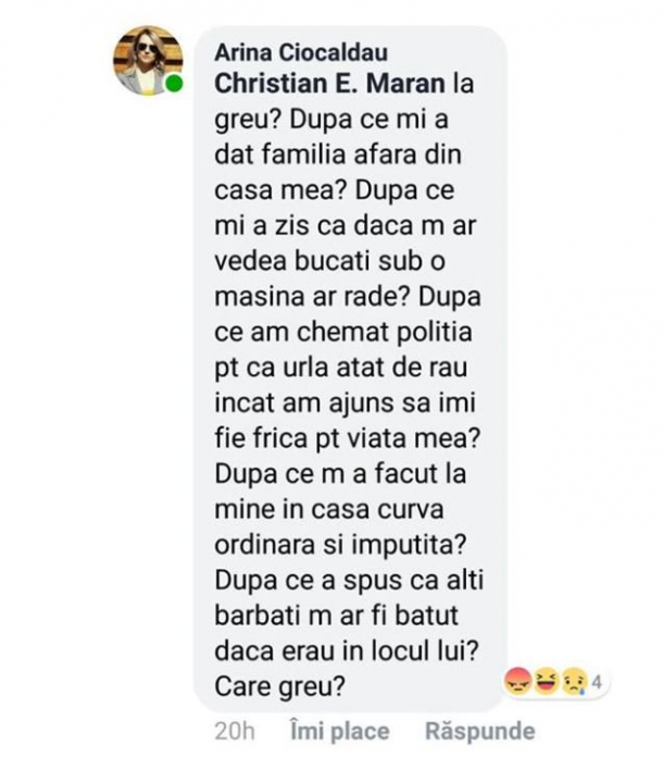 Arina are și un mesaj pentru cei care îi țin partea lui Mălin Bot. Ea spune că fostul prieten este egoist și nerecunoscător. Mai mult, îl compară cu Mircea Badea, ”un circar ca el!”