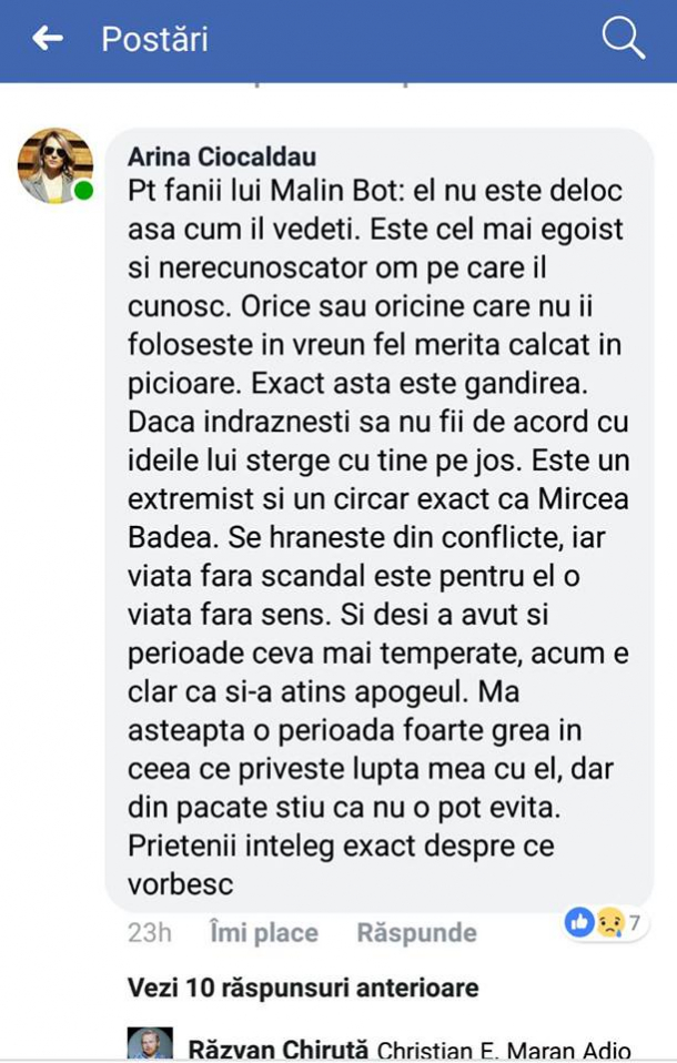 Postarea Arinei Ciocâldău nu a rămas fără răspuns. Susținătoriui i-au sărit în ajutor lui Mălin Bot.