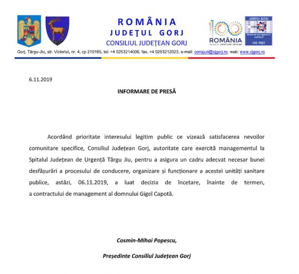 Cu toate acestea, o informare de presă a CJ Gorj arată ei sunt cei care au decis încetarea contractului de management.