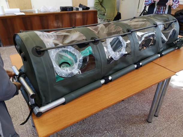 ‘Echipamentul asigură izolarea temporară și transportul în siguranță al personalului suspect sau confirmat a fi contaminat cu agenți biologici, inclusiv SARS-CoV-2, și este dotat cu un sistem de filtro-ventilație cu presiune negativă. Produsul dezvoltat de cercetătorii militari îndeplinește standardele de securitate pentru prevenirea riscurilor de contaminare în zona de izolare și pe traseul de transport al persoanei infestate’, transmite MapN.