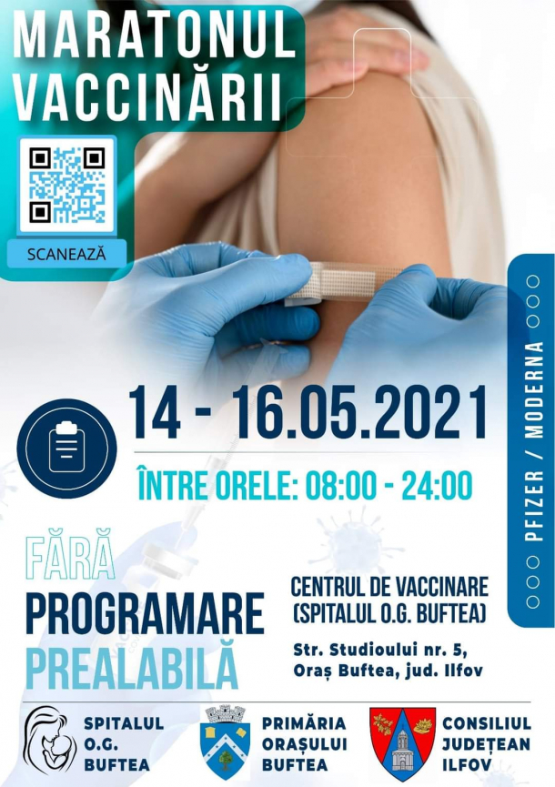 La centrul de vaccinare anti-COVID-19 din Spitalul de Obstetrică Ginecologie Buftea, județul Ilfov, va fi organizat un maraton de vaccinare între 14 și 16 mai 2021, între orele 8 dimineața și 24. Imunizarea se va realiza fără programare prealabilă, practic doar pe baza buletinului de identitate, cu serurile produse de Pfizer-BioNTech sau Moderna. De această oportunitate pot beneficia inclusiv locuitorii din zona limitrofă orașului Buftea.