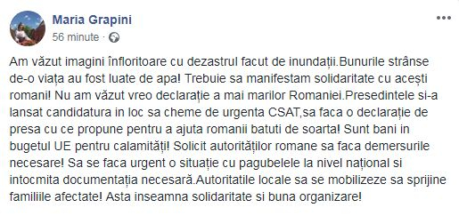 ”Am văzut imagini înfloritoare cu dezastrul facut de inundații.Bunurile strânse de-o viața au fost luate de apa! Trebuie sa manifestam solidaritate cu acești romani! Nu am văzut vreo declarație a mai marilor Romaniei.Presedintele si-a lansat candidatura in loc sa cheme de urgenta CSAT,sa faca o declarație de presa cu ce propune pentru a ajuta romanii batuti de soarta! Sunt bani in bugetul UE pentru calamități! Solicit autorităților romane sa faca demersurile necesare! Sa se faca urgent o situație cu pagubelele la nivel național si intocmita documentația necesară.Autoritatile locale sa se mobilizeze sa sprijine familiile afectate! Asta inseamna solidaritate si buna organizare!”, a scris Maria Grapini pe Facebook.