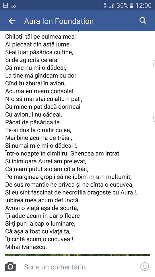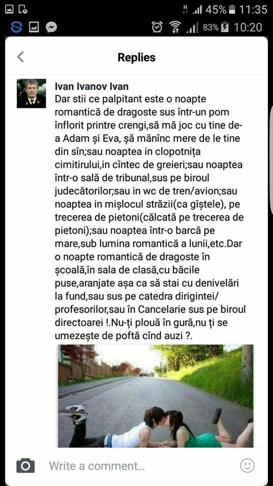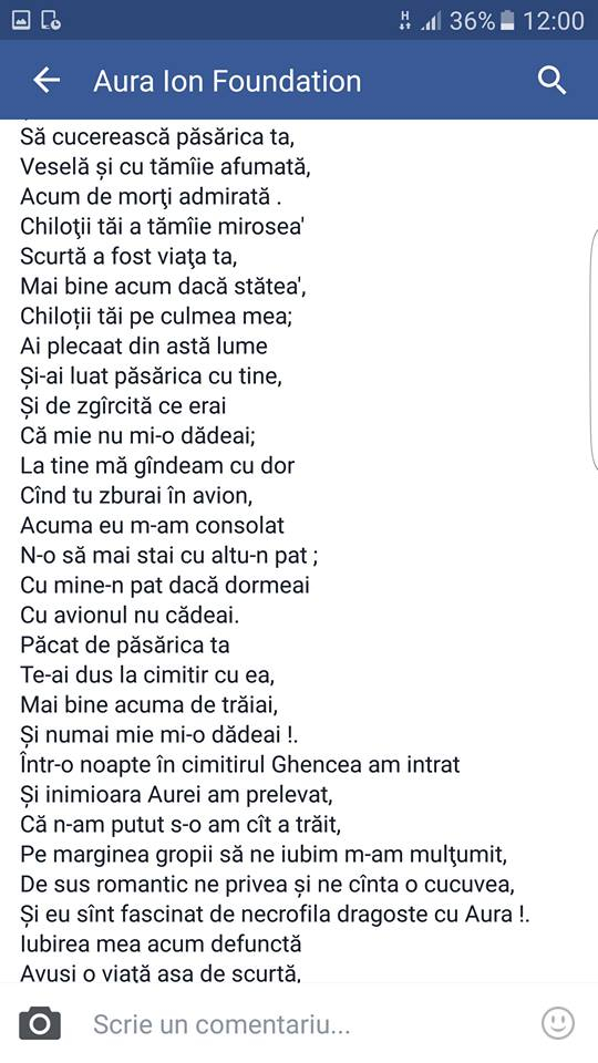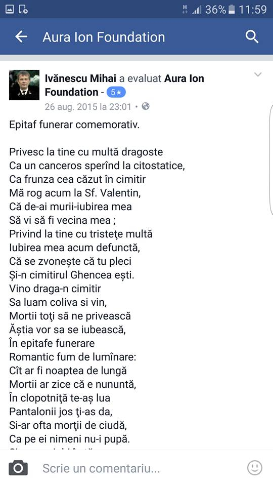 Vă mai amintiți de postarea cu nenea ăsta? E primul print. E domnul poet cu versuri "bacoviene" dedicate fetelor minore şi celor plecate din lumea celor vii. Omul, în loc să fie recunoscător pentru că i-am făcut cunoscută "creația artistică", pe lângă plângerea pe care mi-a făcut-o la IPJ Braşov, are şi pretenții în instanță, simțindu-se lezat că am spus că autorul versurilor "nu-mi pare sănătos."