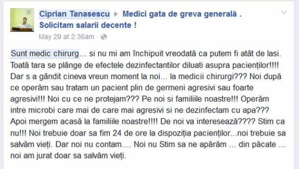 “Sunt medic chirurg… si nu mi am închipuit vreodată ca putem fi atât de lasi. Toată tara se plânge de efectele dezinfectantilor diluati asupra pacienților!!!! Dar s a gândit cineva vreun moment la noi… la medicii chirurgi??? Noi după ce operăm sau tratam un pacient plin de germeni agresivi sau foarte agresivi!!! Noi cu ce ne protejam??? Pe noi si familiile noastre!!! Operăm intre microbi care mai de care mai agresivi si ne dezinfectam cu apa??? Apoi mergem acasă la familiile noastre!!!! De noi va interesează???? Stim ca nu!!! Noi trebuie doar sa fim 24 de ore la dispoziția pacienților…noi trebuie sa salvăm vieți. Dar noi nu contam…. Noi nu Stim sa ne apărăm … din păcate … noi am jurat doar sa salvăm vieți”, a scris Tănăsescu pe Facebook.