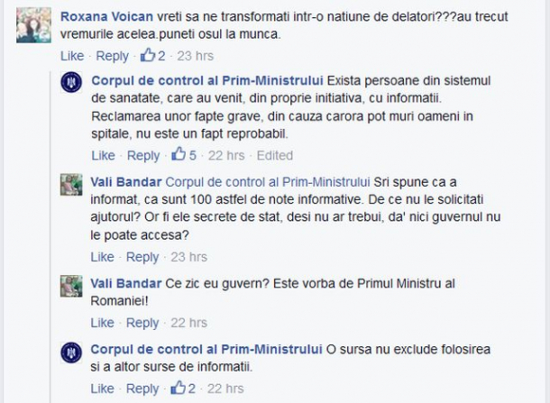 La comentariul unei utilizatoare de Facebook ce acuză că "vreți să ne transformați într-o națiune de delatori", corpul de control a raspuns că "există persoane din sistemul de sănătate, care au venit, din proprie inițiativă, cu informaţii.