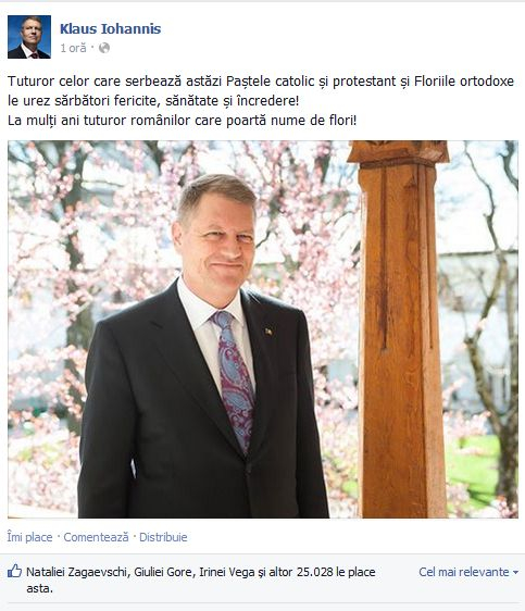 ”Tuturor celor care serbează astăzi Paștele catolic și protestant și Floriile ortodoxe le urez sărbători fericite, sănătate și încredere! La mulți ani tuturor românilor care poartă nume de flori!”, le-a transmis Iohannis românilor, pe Facebook.