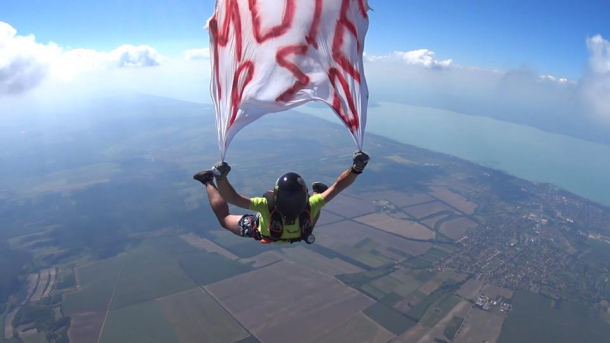 Un alt român, nemulțumit de modul în care social-democraţii guvernează, a sărit din avion cu un banner pe care era inscripţionat cu roşu „M…PSD”.
