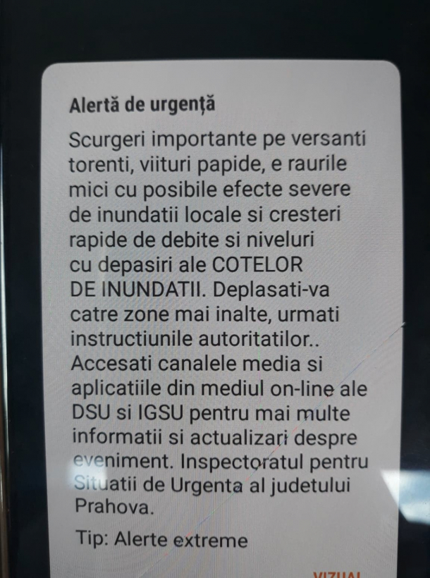 Situație de alertă în județul Prahova. Autoritățile au emis un mesaj Ro-Alert prin care îi avertizează pe prahoveni că ”se vor produce scurgeri importante pe versanți, torenți și viituri rapide pe râurile mici cu posibile efecte severe de inundații”.
