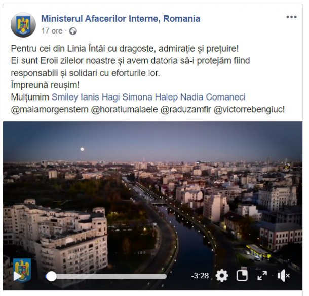 Ministerul Afacerilor Interne a distribuit noul videoclip duminică, 12 aprilie pe contul oficial de Facebook. Imaginile au fost însoțite de un mesaj adresat eroilor aflați în linia întâi în lupta cu noul coronavirus.