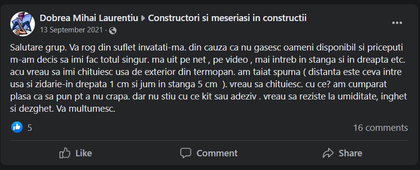 „Vă rog din suflet, învățați-mă. Din cauza ca nu găsesc oameni disponibil si pricepuți m-am decis sa îmi fac totul singur. Mă uit pe net , pe video , mai întreb în stânga și în dreapta. Vreau să îmi chituiesc ușa de exterior din termopan. Am tăiat spuma. Vreau să chituiesc. Cu ce? Am cumpărat plasă ca să pun pentru a nu crapă, dar nu știu cu ce kit sau adeziv. Vreau sa reziste la umiditate, îngheț și dezgheț”, scrie un utilizator pe un grup de Facebook.
