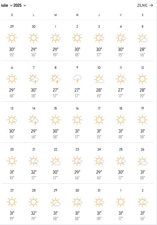 În iulie, cea mai mare temperatură va fi de 32 de grade Celsius, în zilele de 21 și 28, iar cea mai mică va fi de 27 de grade, în zilele de 8, 9 și 11 iulie.