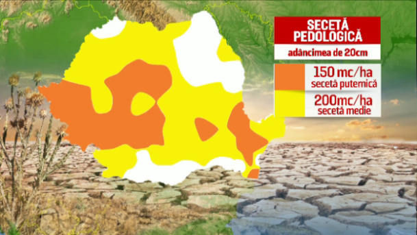 Meteorologii avertizează că toată suprafața arabilă a României este afectată de secetă. În zone vaste din veste, centru și est rezervă de apă din sol nu depășește 150 de metri cubi la hectar, când ea ar fi trebuit să fie la 450 de metri cubi, informează ProTV.