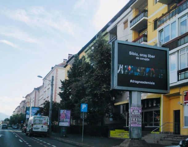 „Sibiu, oraş liber de corupţie/ #dragneademisia” apare pe un panou publicitar bulevardul Calea Dumbrăvii din Sibiu.