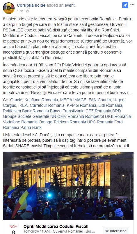 Începând cu ora 11:00, vom fi în Piața Victoriei pentru a opri această nouă OUG toxică. Facem apel la marile companii din România să susțină acest protest și să le dea câteva ore libere prin rotație angajaților, pentru a veni alături de noi. Să nu se lase intimidate de teoriile conspirației și să înțeleagă că este ultima șansă de a lupta împotriva unei ”Revoluții Fiscale” care le va pune în pericol business-ul", scrie "Corupția Ucide" pe Facebook.