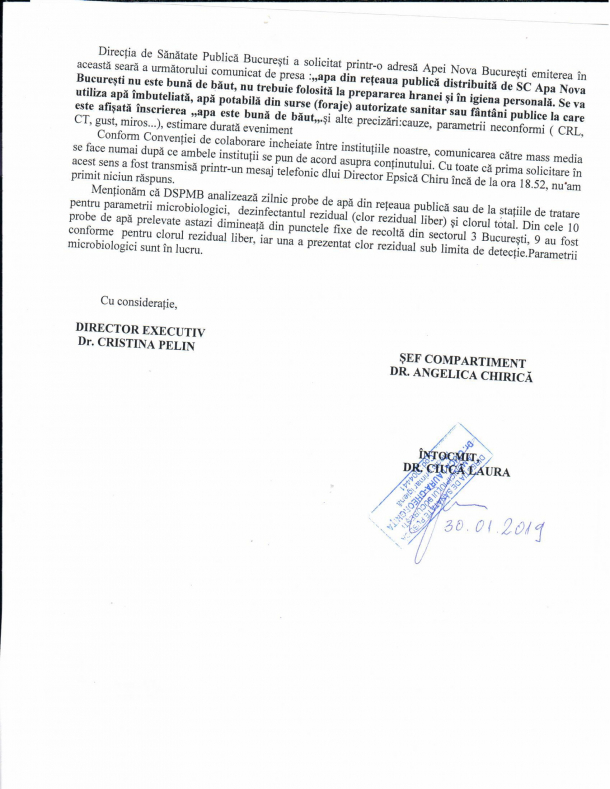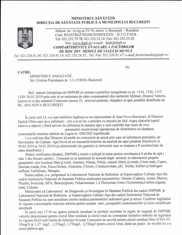 Urmare a speculațiilor lansate în spațiul public, Ministerul Sănătății face publică informarea transmisă de Direcția Sănătate Publică a Municipiului București primită în seara de 30 ianuarie 2019 în baza căreia ministrul Sănătății, Sorina Pintea a luat decizia de a informa cetățenii privind calitatea apei din municipiul București și de a transmite recomandările sprecialiștilor în sănătate publică referitor la consumul de apă din rețeaua publică. Ministerul Sănătății veghează la asigurarea sănătății publice și va informa întotdeauna populația corect și transparent, cu privire la subiectele legate de asigurarea sănătății publice”, se arată în comunicatul de presă al ministerului.