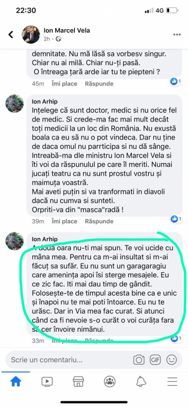 „A doua oară nu-ți mai spun. Te voi ucide cu mâna mea. Pentru că m-ai insultat și mai făcut să sufăr. Eu nu sunt un gargaragiu care amenință apoi își șterge mesajele. Eu ce zic fac. Îți mai dau timp de gândit”, a scris Ion Arhip la o altă postare a lui Marcel Vela.