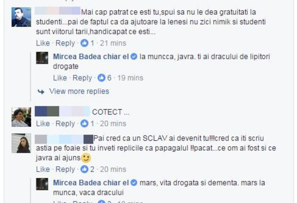 Când un internaut a scris că studenții sunt viitorul țării, Badea a avut o reacție virulentă: „La muncă, javră! Ți-ai dracului de lipitori drogate!”.