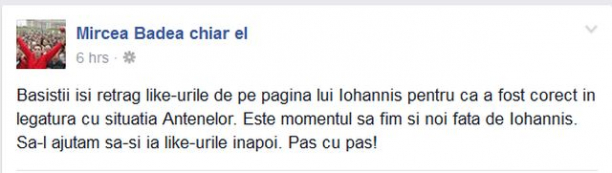 „Băsiștii își retrag like-urile de pe pagina lui Iohannis pentru că a fost corect în legătură cu situația Antenelor. Este momentul să fim și noi față de Iohannis. Să-l ajutăm să-și ia like-urile înapoi. Pas cu pas!, a scris Mircea Badea pe Facebook.
