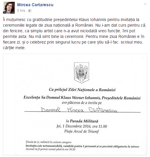 "Îi mulțumesc cu gratitudine președintelui Klaus Iohannis pentru invitația la ceremoniile legate de ziua națională a României. Nu i-am dat curs pentru că, din fericire, ca simplu artist care n-a avut niciodată vreo funcție, îmi pot permite asta. Nu mă simt bine la ceremonii. Pentru mine ziua României e în fiecare zi, și o celebrez prin singurul lucru pe care știu să-l fac: scrisul meu, cărțile mele”, a scris Mircea Cărtărescu pe reţeaua socială.