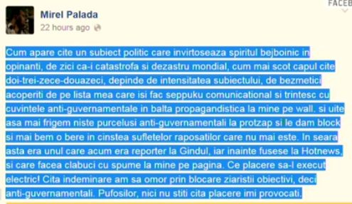 Purtătorul de cuvânt al Guvernului, Mirel Palada, atacă pe Facebook jurnaliștii. Acesta s-a lăudat cum e executat un ziarist, care avea opinii anti-guvernamentale.