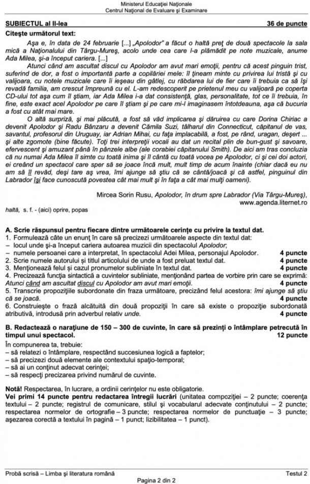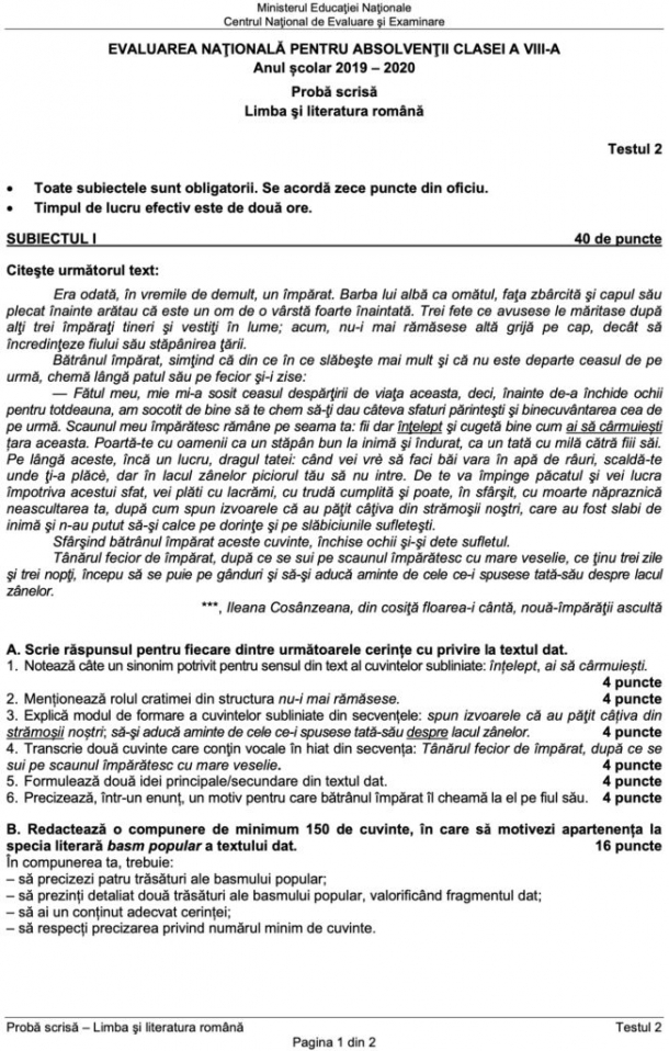 Exemplu de teste de Limba și Literatura Română pentru Evaluarea Națională:
