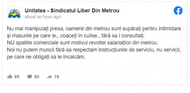 „Nu mai manipulați presa, oamenii din metrou sunt supărați pentru intimidare și masurile pe care le ,,coaceți în culise., fără sa-i consultați. NU spatiile comerciale sunt motivul revoltei salariaților din metrou. Noi nu putem muncii fără sa respectam instrucțiunile de serviciu, nu servicii, pe care ne obligați sa le încalcăm…Metroul este datoria noastră! Îl apărăm pana la sfârșit!…Noi toti am ales să ne apărăm drepturile, pentru că nu putem menţine tăcerea în faţa nedreptăţii.”, au transmis sindicațiștii în postări.