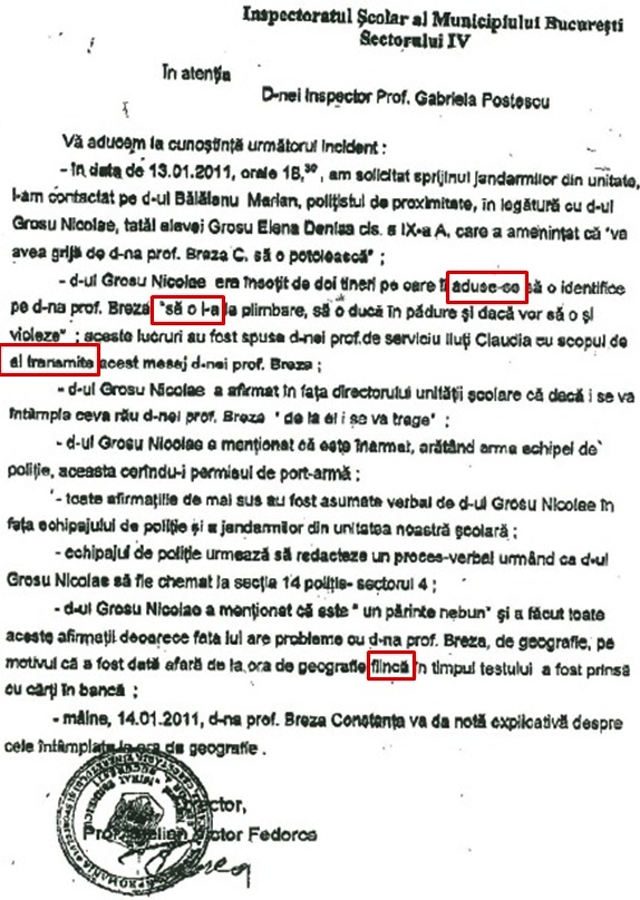 Fedorca trimitea o sesizare inspectorului Gabriela Postescu de la Inspectoratul Şcolar al Sectorului IV, în care semnala un incident petrecut în colegiul unde era director. În document apar mai multe greşeli de ortografie.