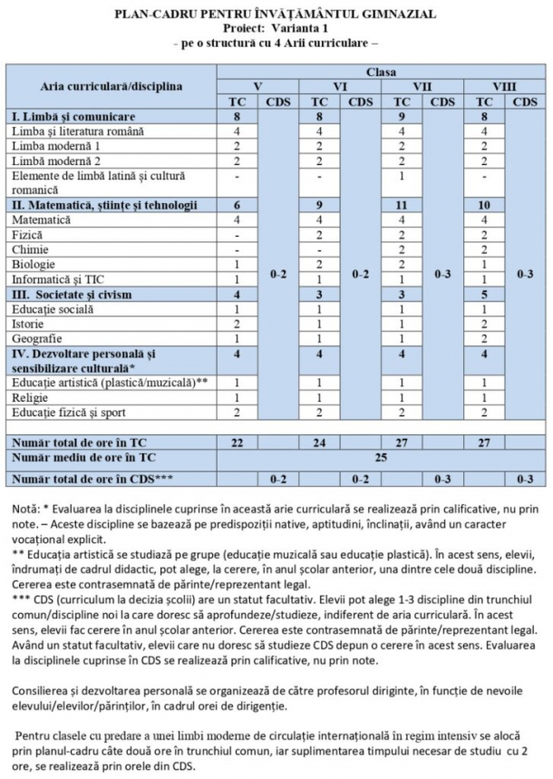 Planul-cadru pentru gimnaziu – Varianta 1