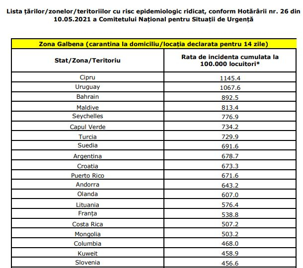 Comitetul Național pentru Situații de Urgență (CNSU) a adoptat, luni, Hotărârea cu numărul 26, prin care este actualizată lista țărilor și teritoriilor considerate cu risc epidemiologic ridicat. Persoanele care sosesc în România din aceste zone trebuie să stea în carantină.
