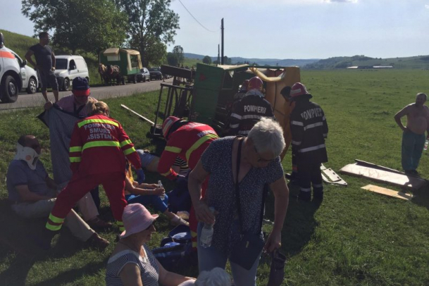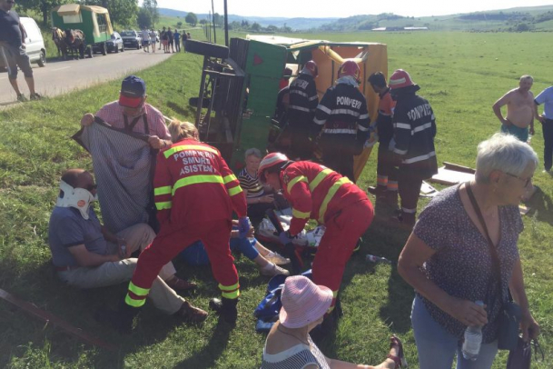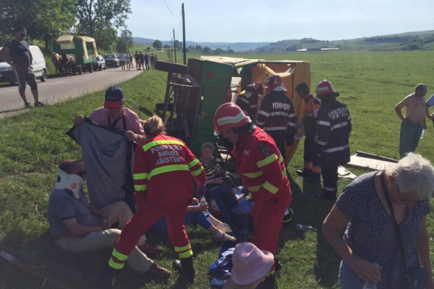 Vacanța s-a terminat cum nu se putea mai prost! Nouă turiști străini au ajuns la spital, după ce S-AU RĂSTURNAT CU CĂRUȚA în Sibiu (FOTO)