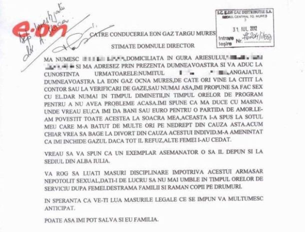 O clientă a societății EON Gaz din Târgu Mureș a sesizat firma că angajatul care citește contorul și verifică instalația de gaze i-a făcut o propunere cel puțin nepotrivită. Bărbatul, spune ea, îi cere constant să facă sex cu el, îi spune că va plăti pentru aceste favoruri și o amenință că îi taie gazele dacă refuză.