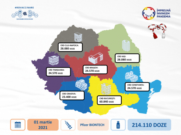 Comitetul Național de Coordonare a Activităților de Vaccinare anti-COVID a anunțat că luni, 1 martie, soseșete o nouă tranșă de ser Pfizer – BioNTech. Transportul constă în 214.110 de doze, care vor fi distribuite către centrele regionale de vaccinare din România.