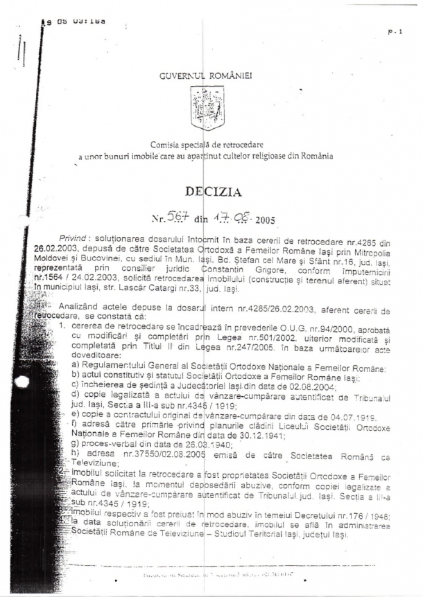 Pentru imobil s-au luptat mai multe capete bisericești, dar clădirea a revenit Societății Naționale a Femeilor Ortodoxe Române Iași, o entitate juridică cunoscută în Iași, care a invocat un act de proprietate din 1919. În 2008, SFOR a intrat în posesia proprietăților din Iași. „Într-o plângere ce a ajuns pe masa procurorilor se ridică, însă, o problemă gravă de legalitate: una dintre cele trei clădiri oferite gratuit către SFOR, a cărei suprafaţă este mare mare decât suma celorlalte două, ar fi fost construită, de fapt, de comunişti şi nu se afla în patrimoniu entităţii a cărei continuatoare a susţinut SFOR că este înainte de naţionalizare. Retrocedarea acelei clădiri, un imobil cu o suprafaţă desfăşurată de 2.600 de metri pătraţi, s-ar fi făcut, astfel, cu încălcarea legilor din domeniu, aspect ce urmează a fi verificat de procurori”, informează Adevărul. Cea care a semnat actul retrocedării este fosta șefă a ANRP, Ingrid Zaarour, trimisă în judecată de DNA pentru alte retrocedări ilegale.