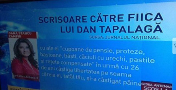 Vehement criticată în zona reţelelor de socializare, scrisoarea al cărei destinatar este fiica lui Dan Tapalagă (Hotnews), în vârstă de 10 ani, reprezintă modul în care jurnalista Antenei 3 vrea să-l sancționeze pe acesta pentru replicile sale acide la adresa trustului Intact și a persoanelor care au protestat față de măsura pe care a dispus-o Fiscul în cazul clădirilor Antenelor, confiscate în dosarul ICA.