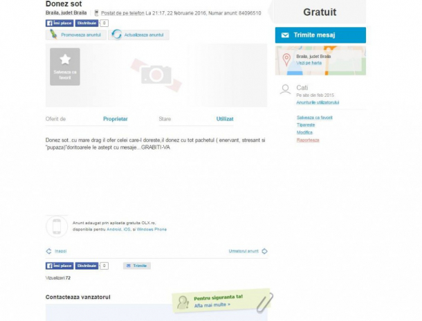 Cati din Brăila scrie că „donez soţ…cu mare drag îl ofer celei care-l doreşte, îl donez cu tot pachetul (enervant, stresant şi pupăza). Doritoarele le aştept cu mesaje… Grabiţi-vă”.